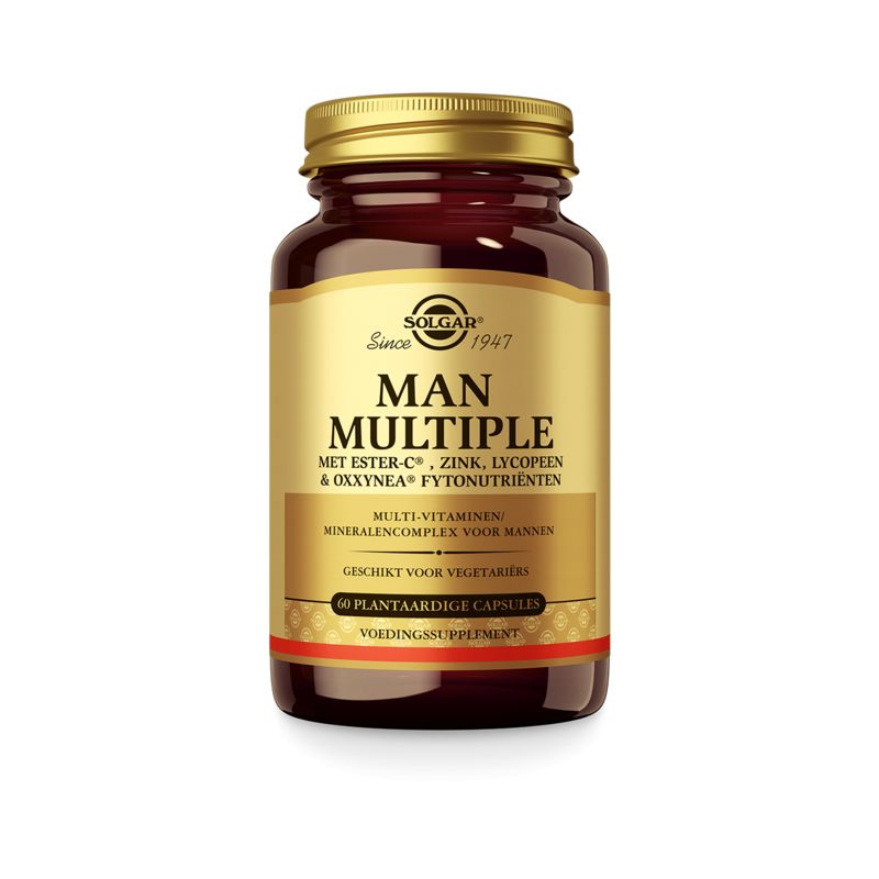 Solgar Man Multiple is een premium multi die volgens de laatste inzichten, zorgvuldig samengesteld is voor mannen met een actieve leefstijl. Het complex is compleet in vitaminen en mineralen en bevat de geregistreerde vorm van vitamine C (Ester-C®), folaat als Metafolin®, plus onder andere zink, selenium en lycopeen. Aangevuld met kruidenextracten (o.a. ginseng en Rhodiolife® rhodiola) en groente- en fruitextracten (Oxxynea®) is deze formule specifiek afgestemd op mannen.
