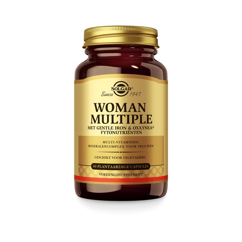 Solgar Woman Multiple is een premium multi die volgens de laatste inzichten, zorgvuldig samengesteld is voor vrouwen met een actieve leefstijl. Het complex is compleet in vitaminen en mineralen en bevat de geregistreerde vorm van vitamine C (Ester-C®), de actieve vorm van folaat (Metafolin®), ijzer in maagvriendelijke vorm (Gentle Iron) en vitamine B6 als pyridoxine en P-5-P. Aangevuld met kruiden-, groente- en fruitextracten (Oxxynea®) is deze formule specifiek afgestemd op vrouwen.